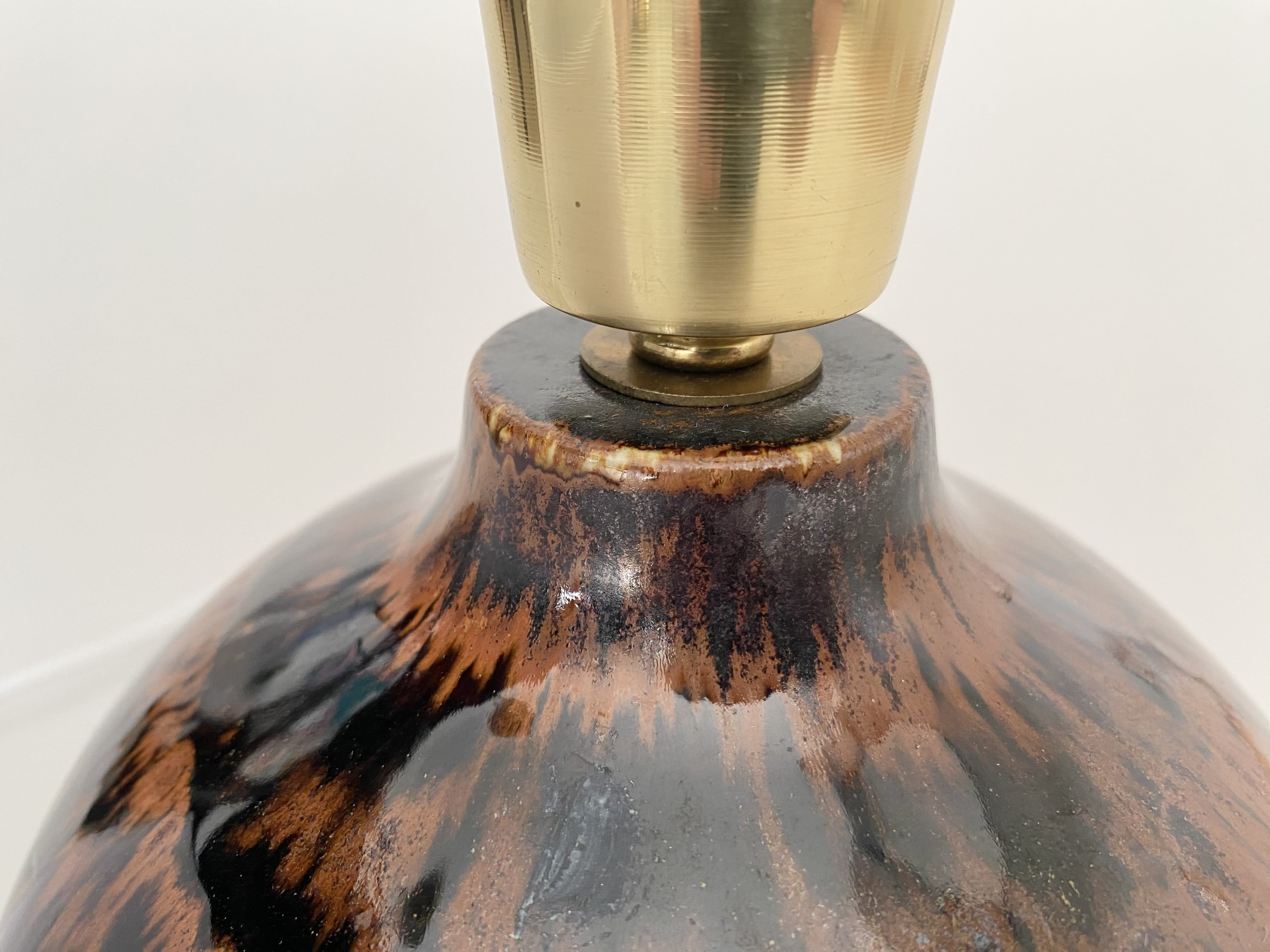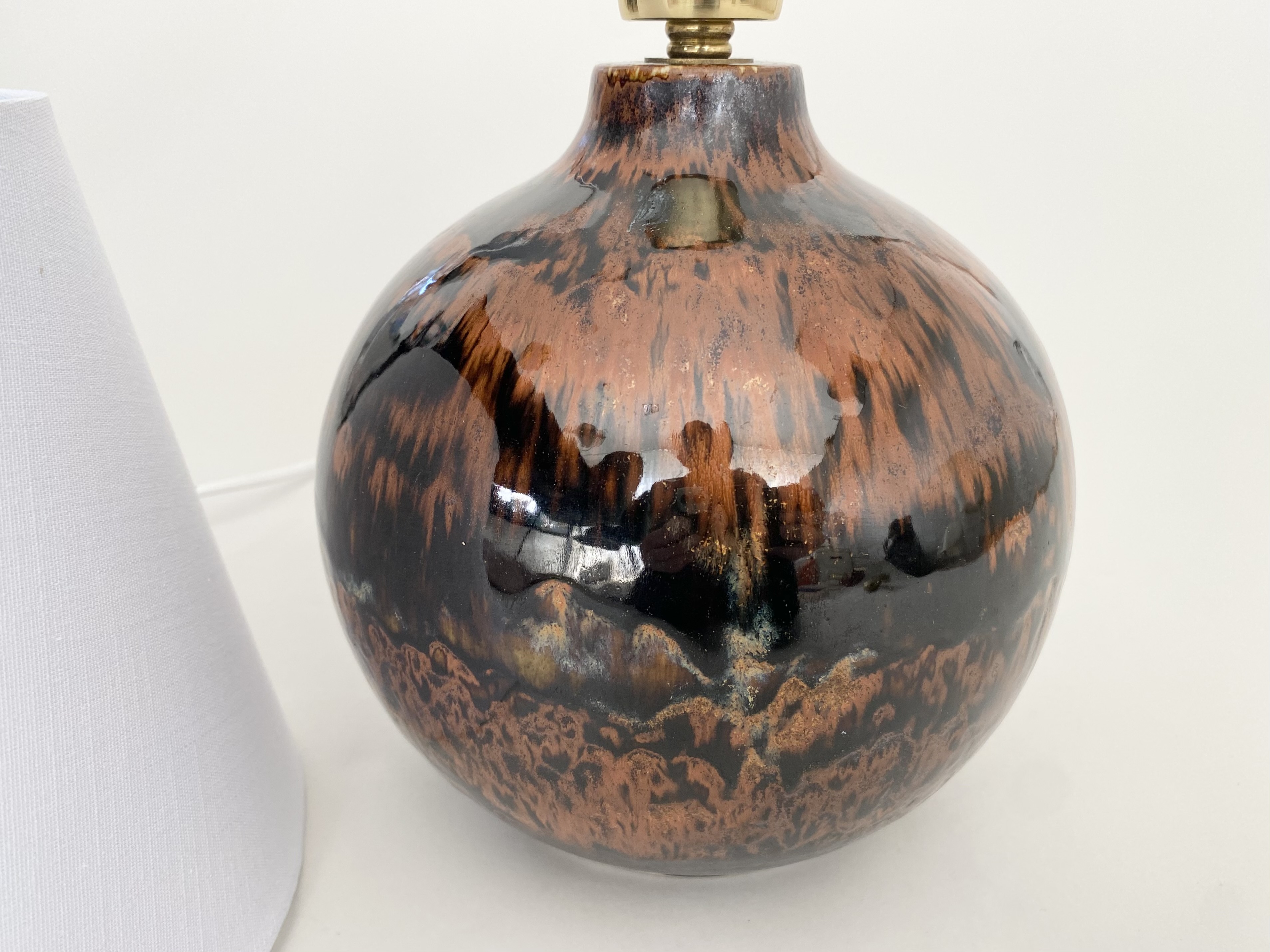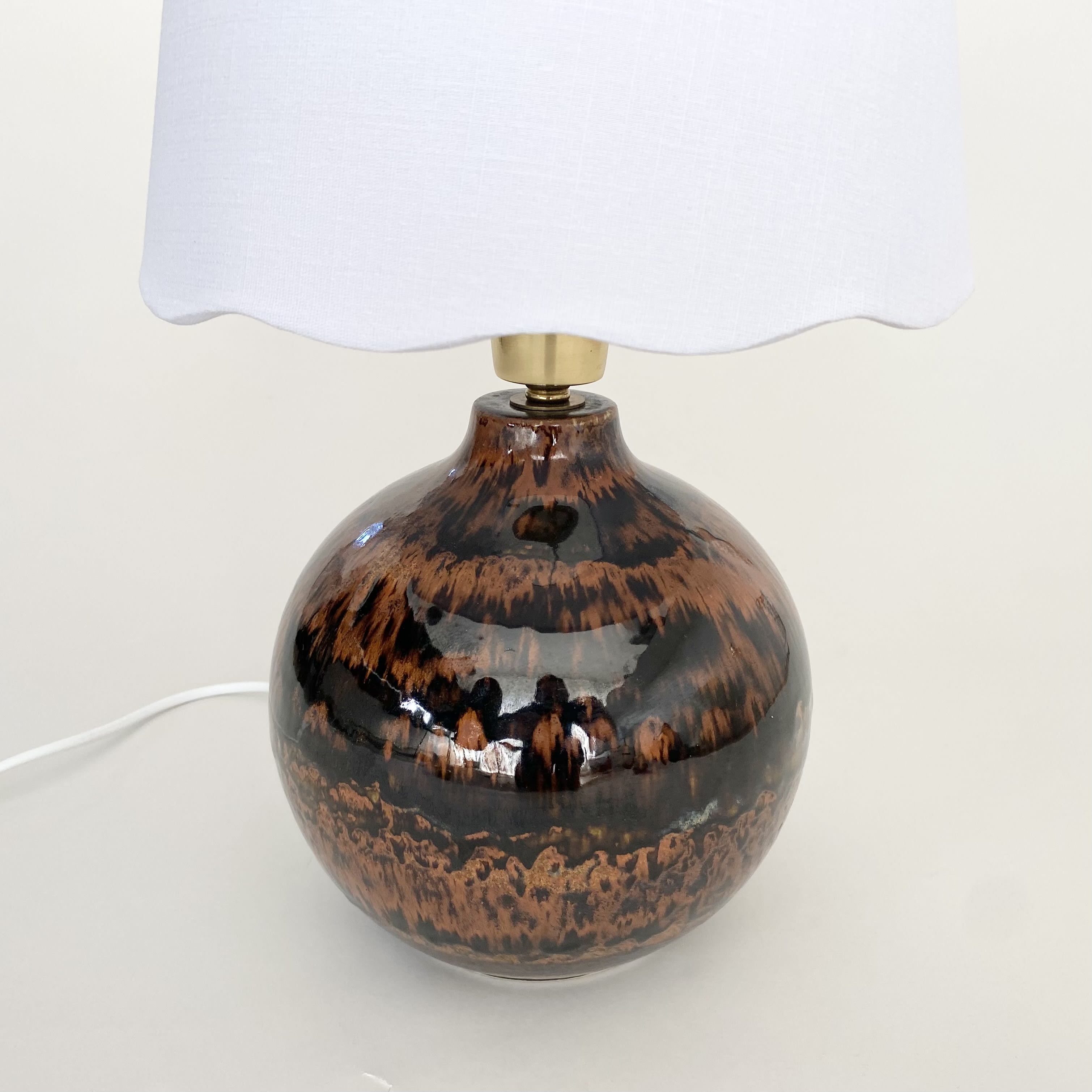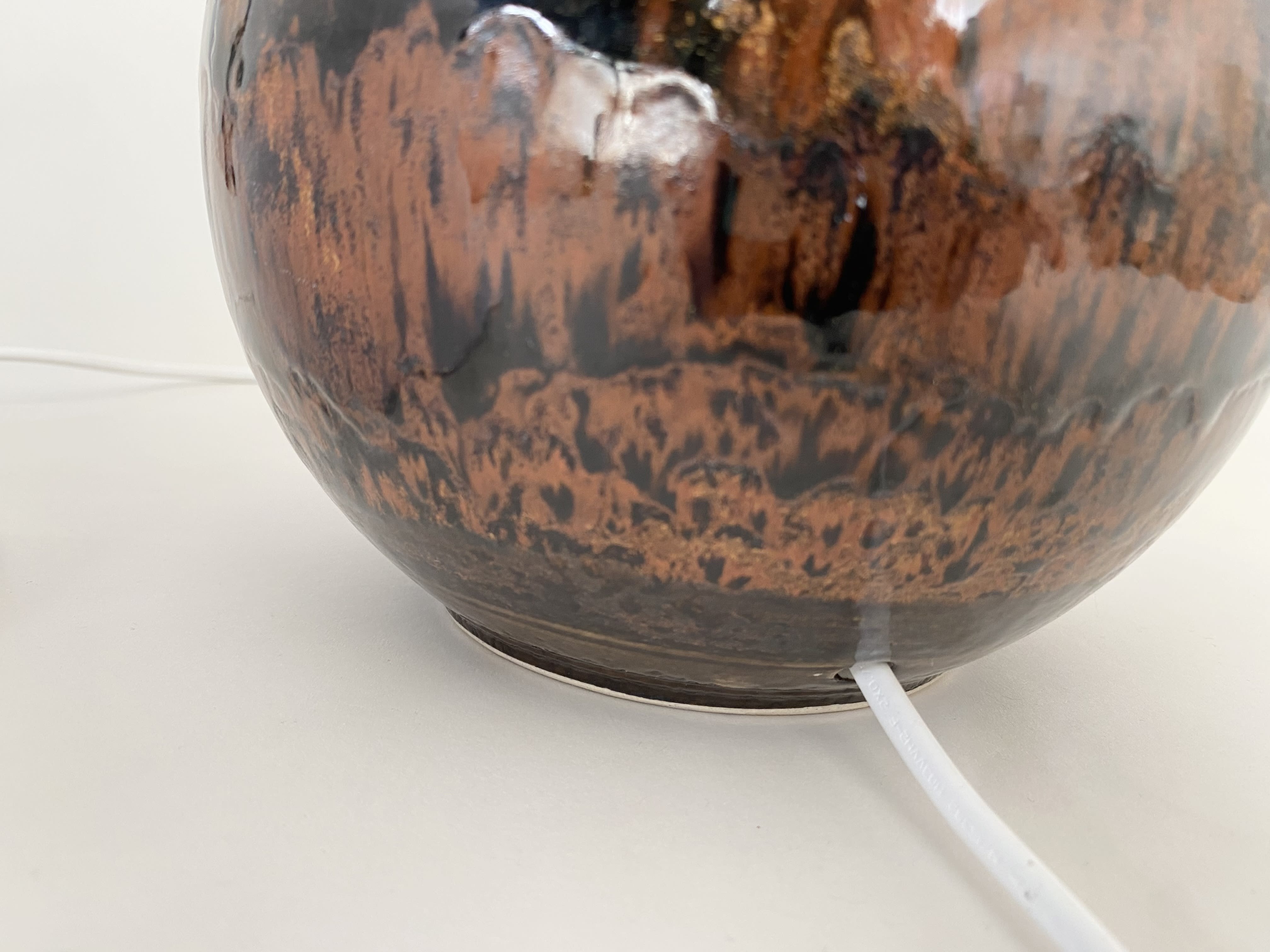 Beautiful ceramic table lamp with a mix of glossy dark brown and brunt orange/brow glazes. The lamp is made in the 60s. It is in very good condition. It is signed at the bottom. It has new european standard electics and new shade.