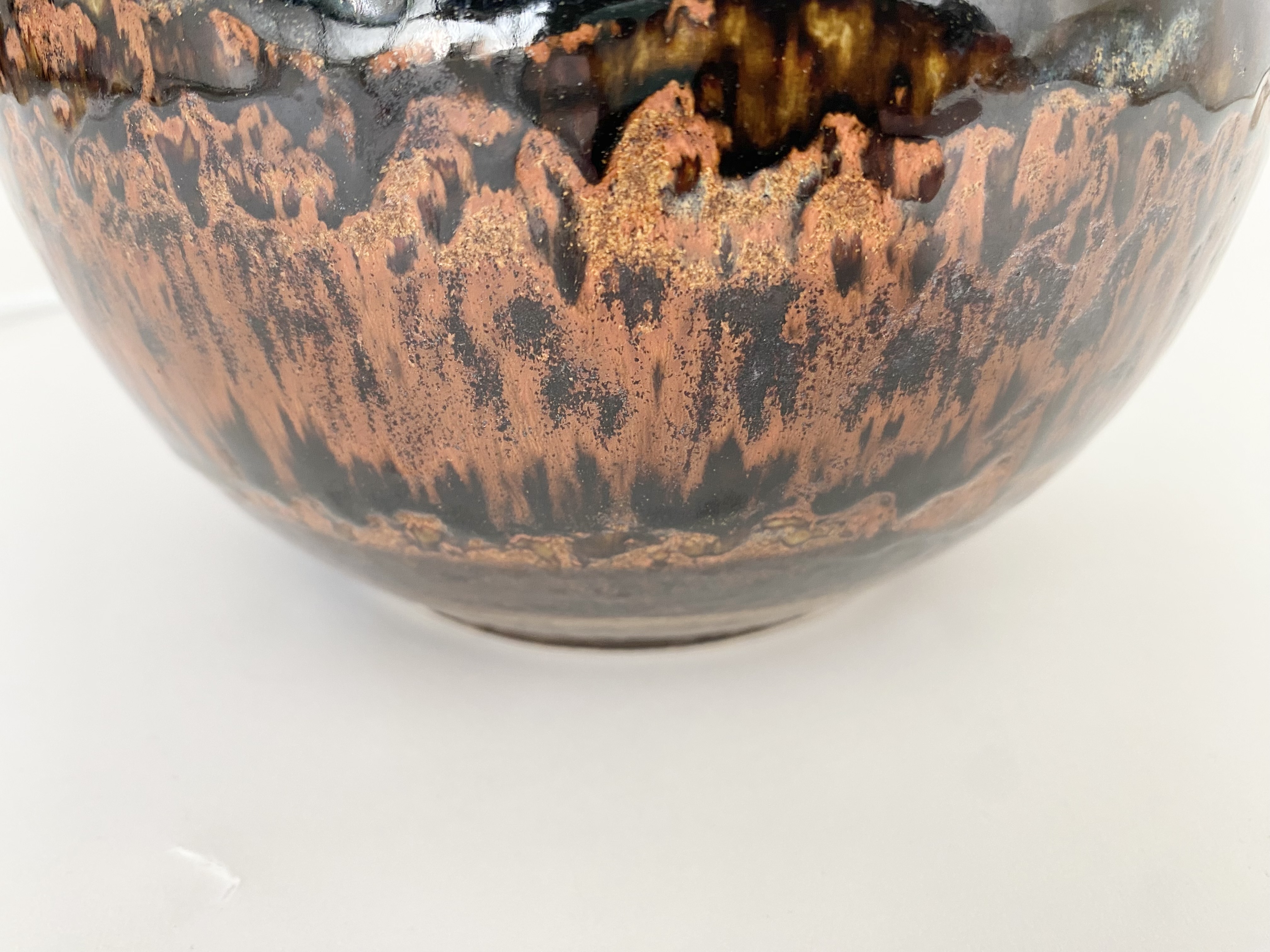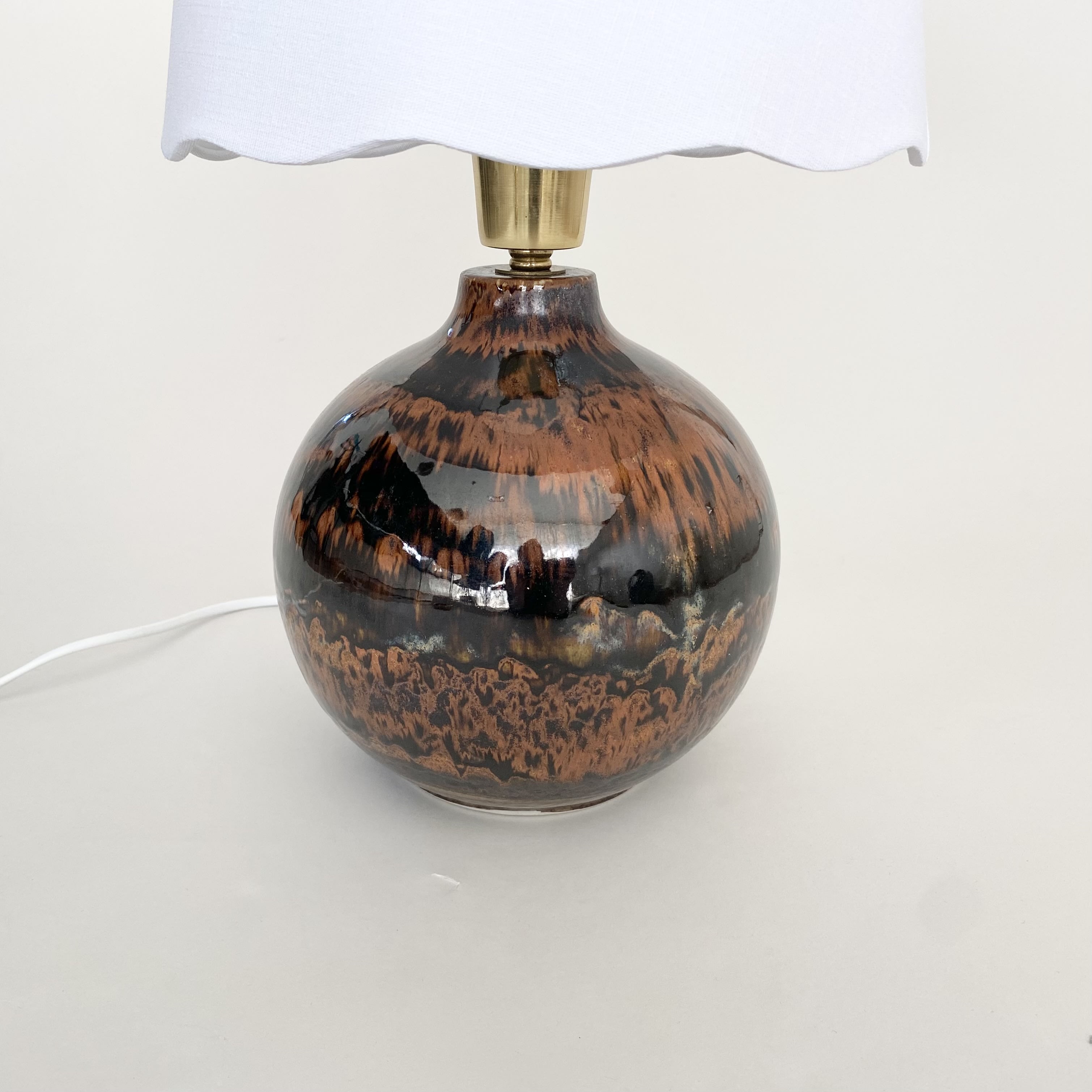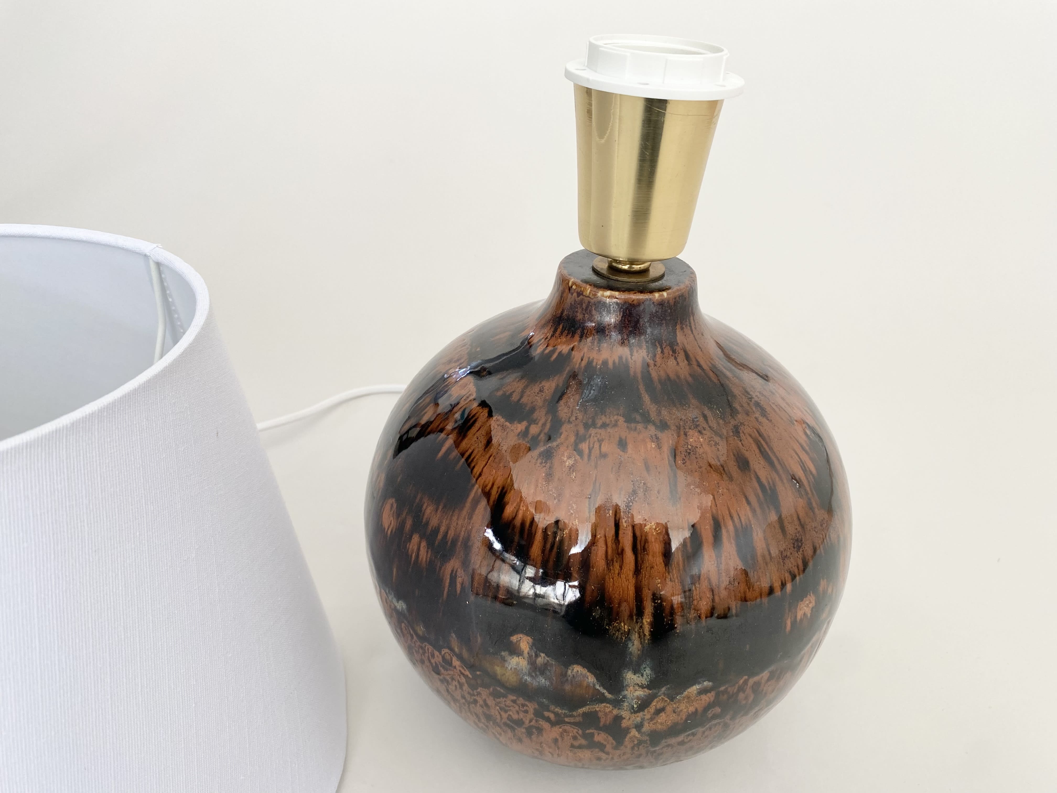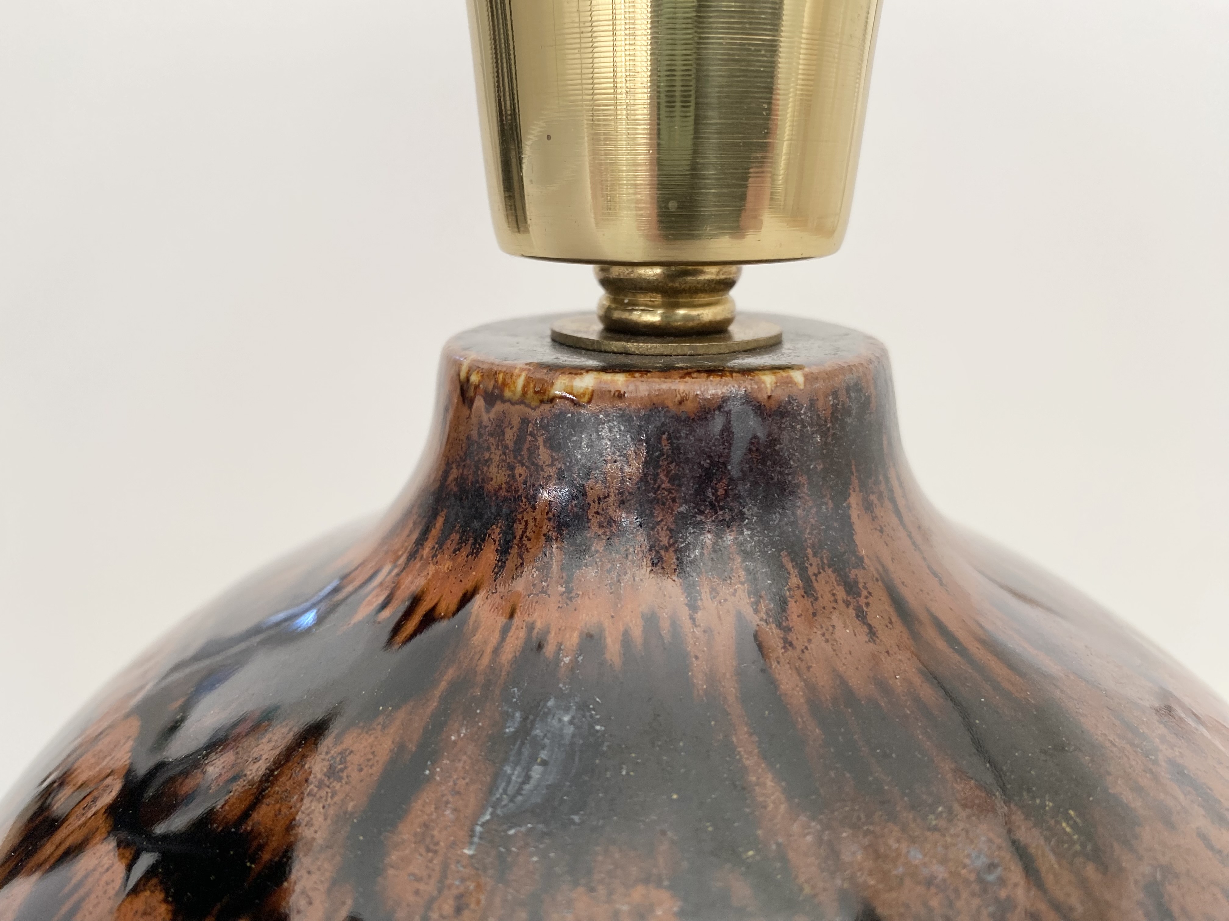 Beautiful ceramic table lamp with a mix of glossy dark brown and brunt orange/brow glazes. The lamp is made in the 60s. It is in very good condition. It is signed at the bottom. It has new european standard electics and new shade.