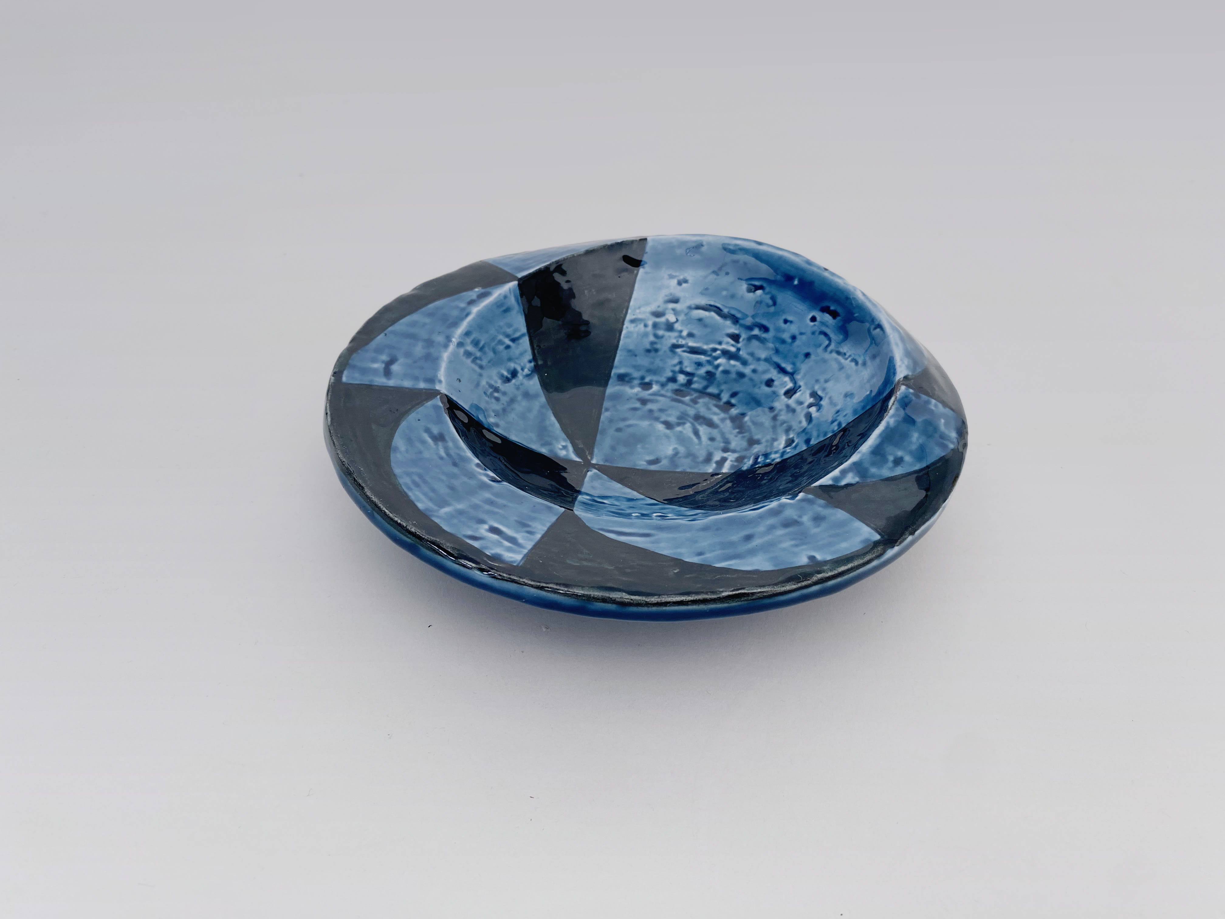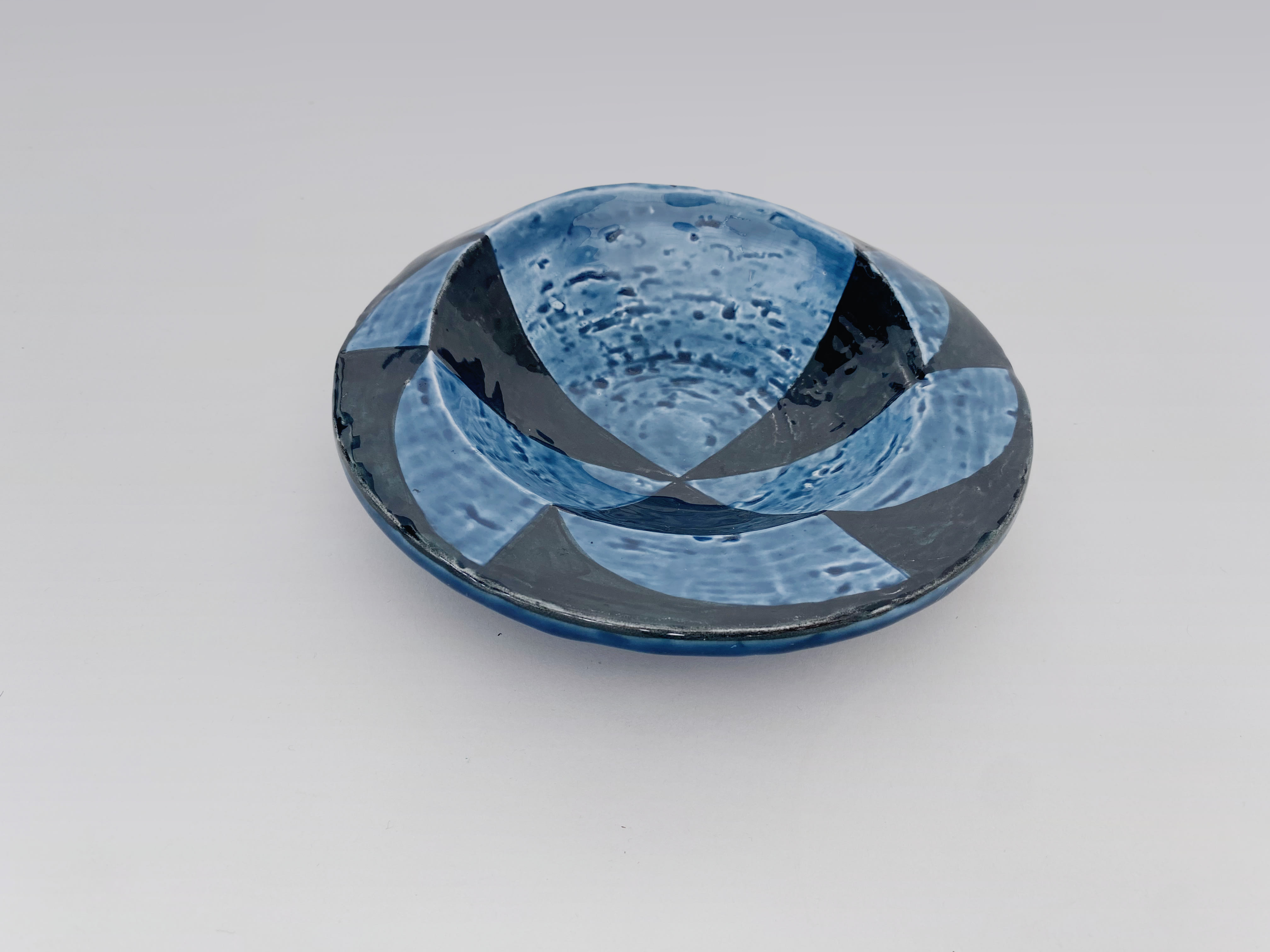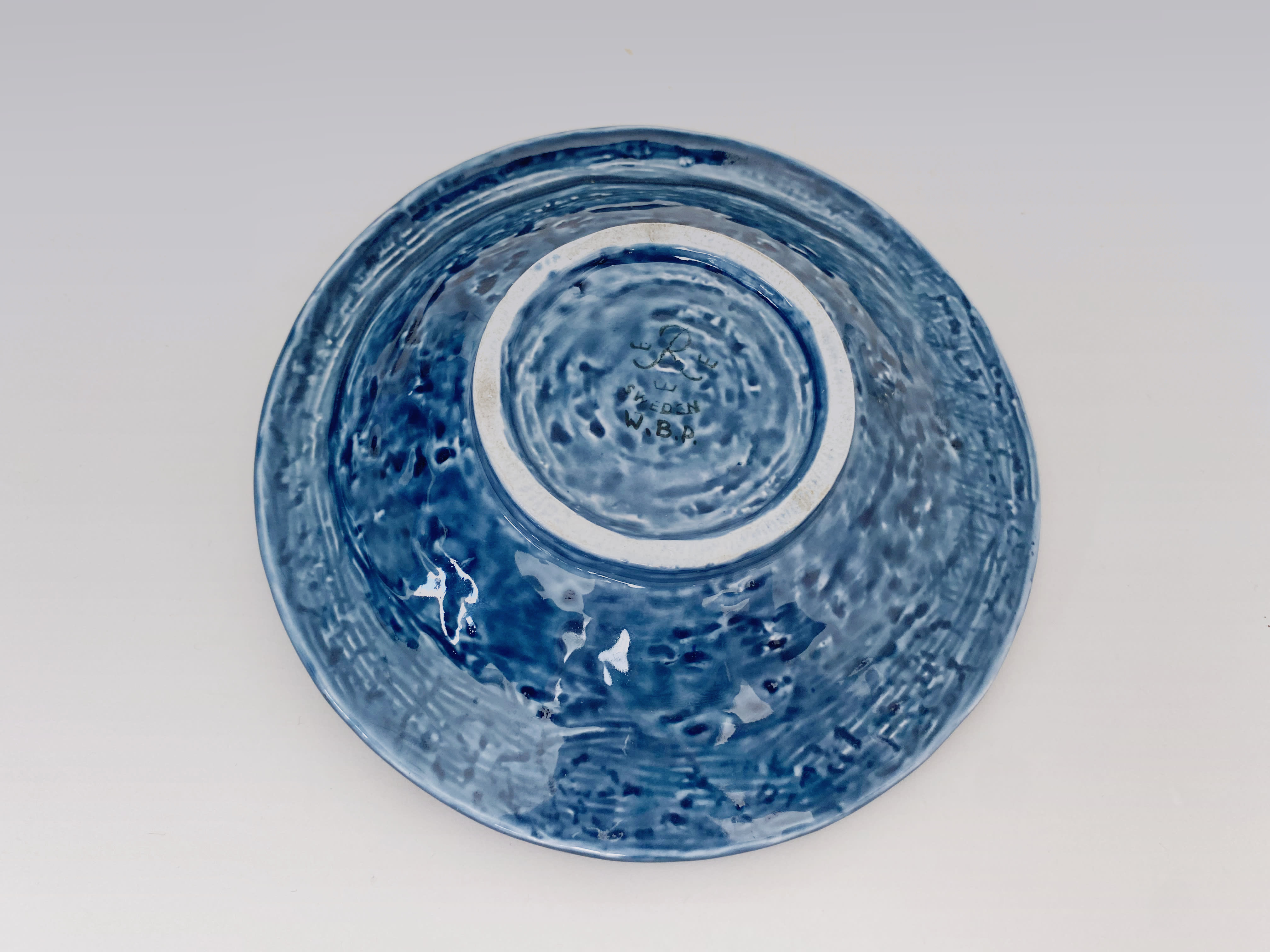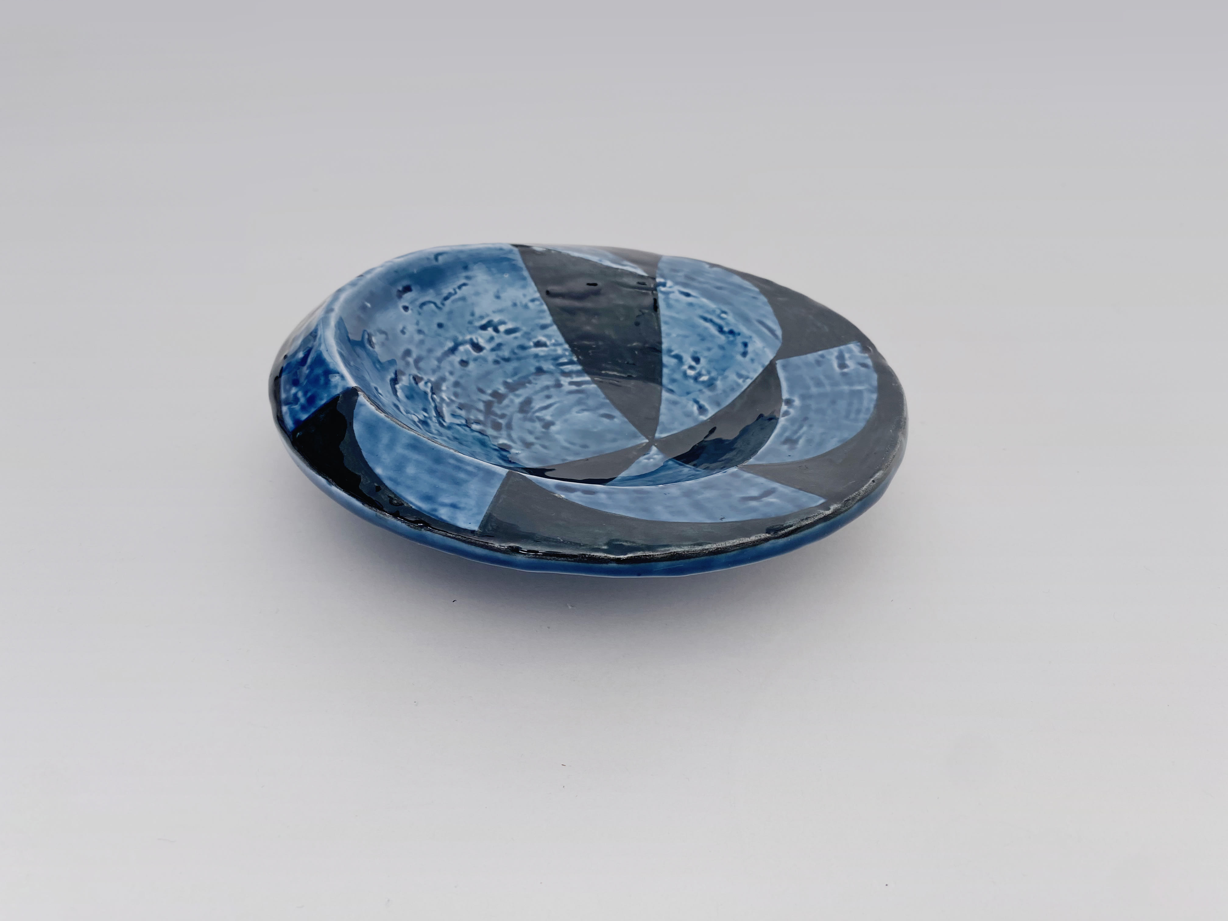 Biomorphic shaped chamotte clay bowl with blue and black geometric pattern. Designed by Vilhelm Bjerke Petersen for Rörstrand in the 50's. Mint condition.