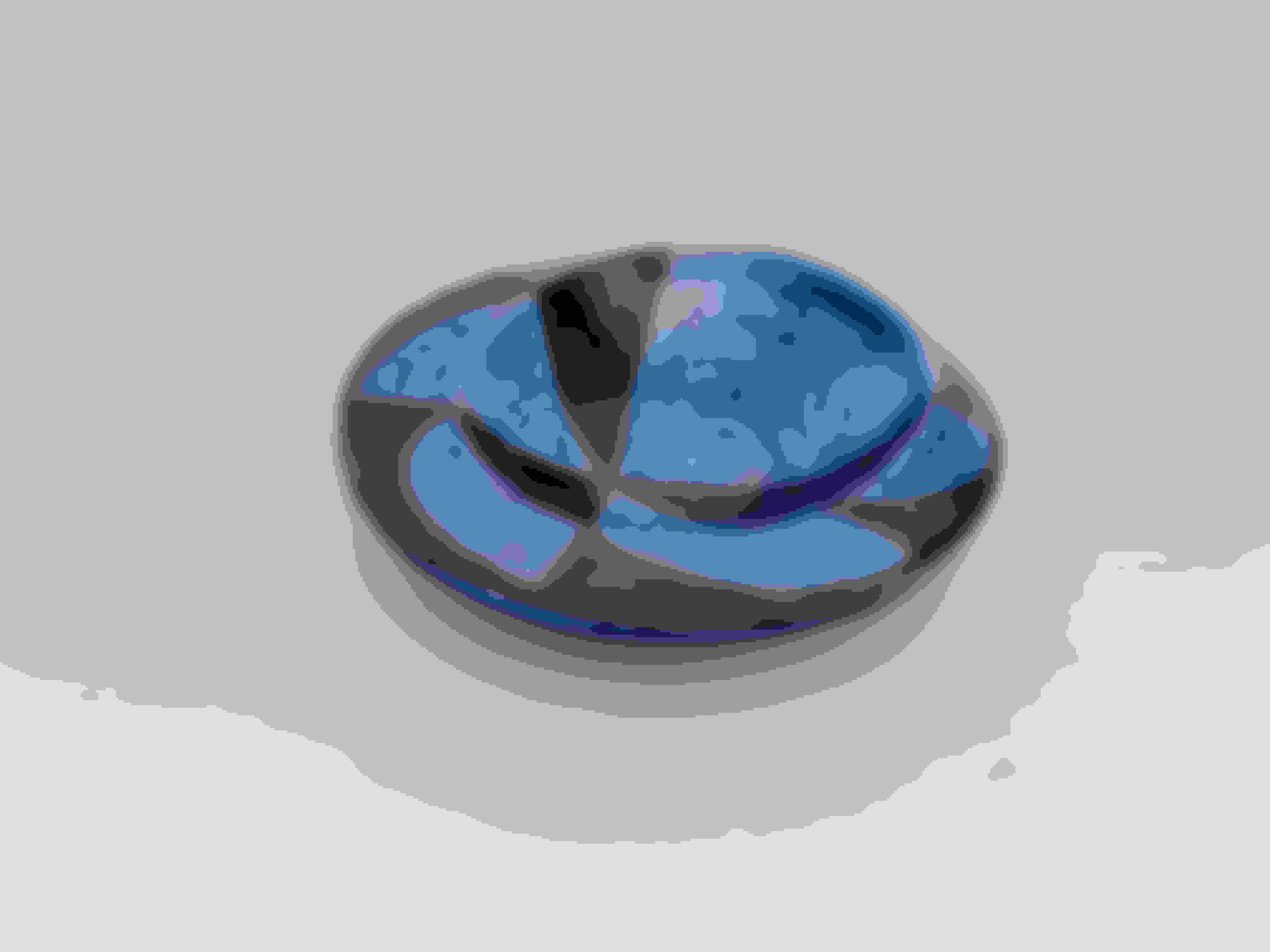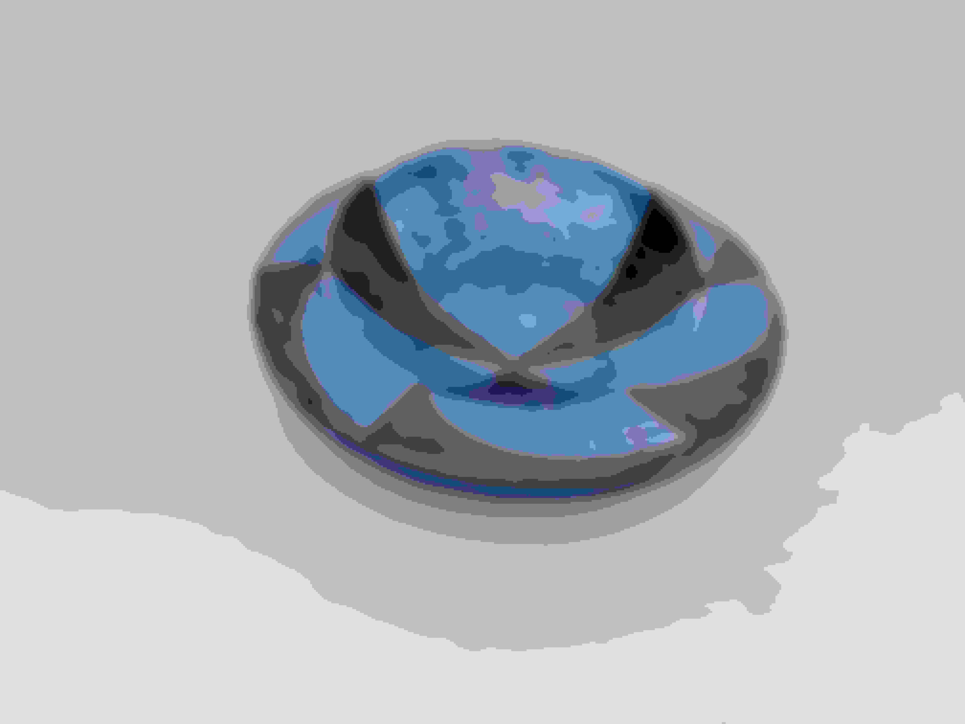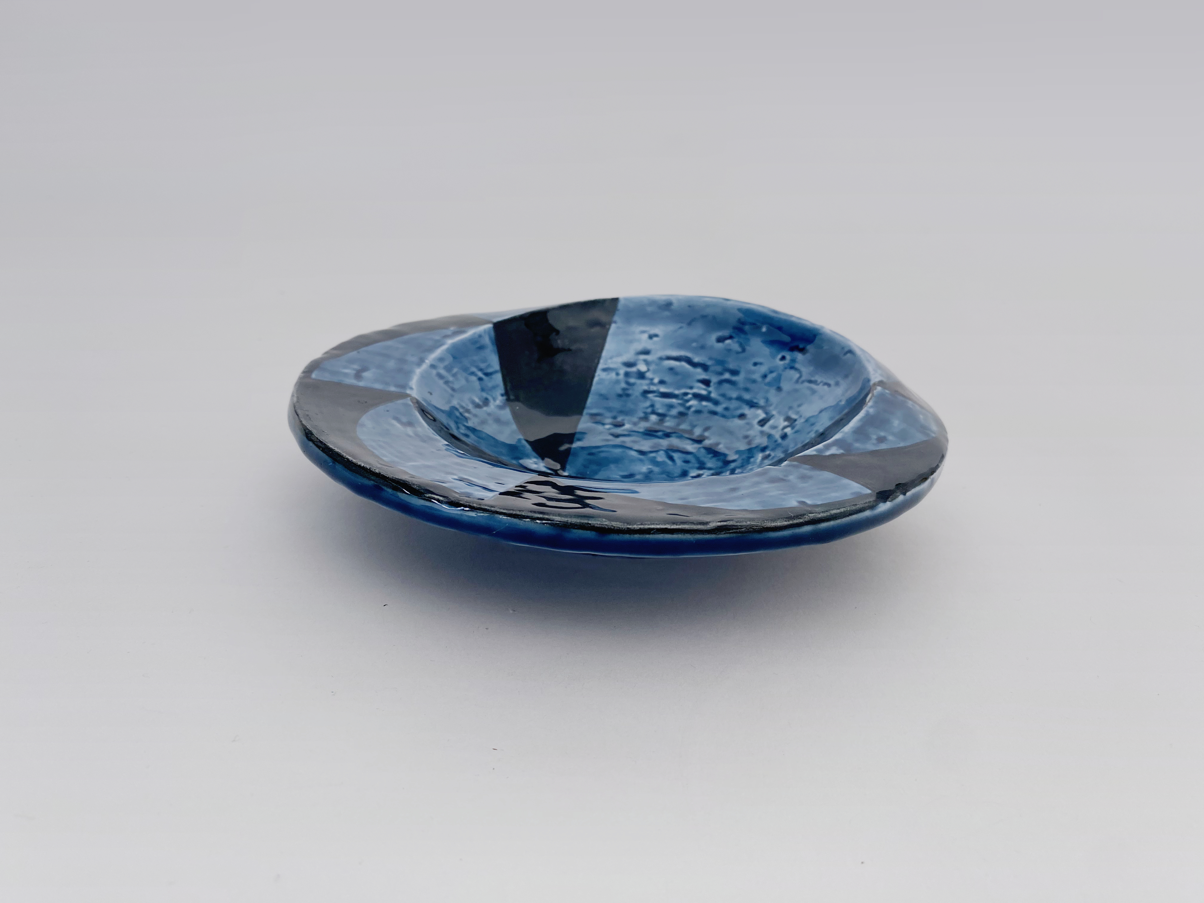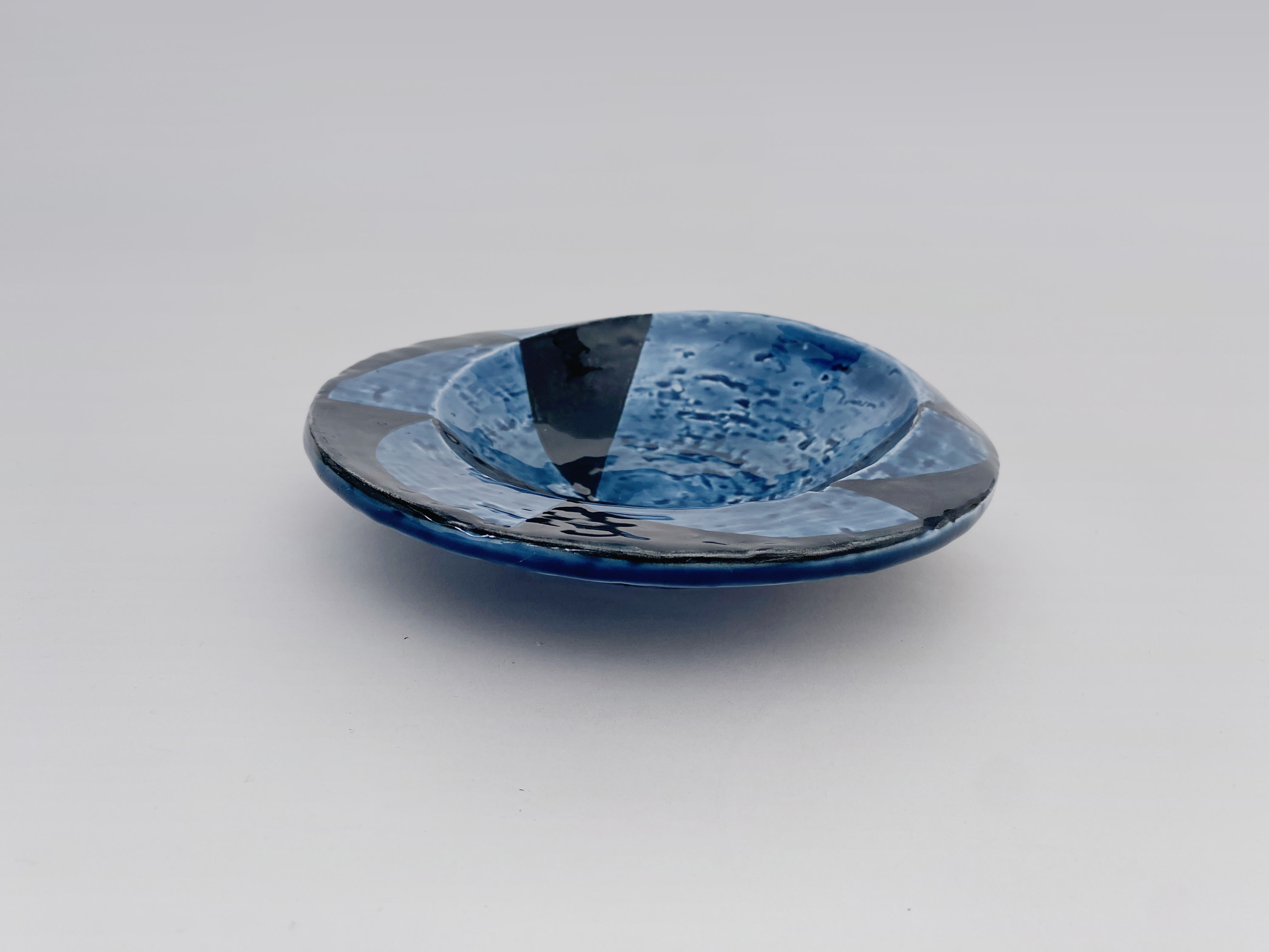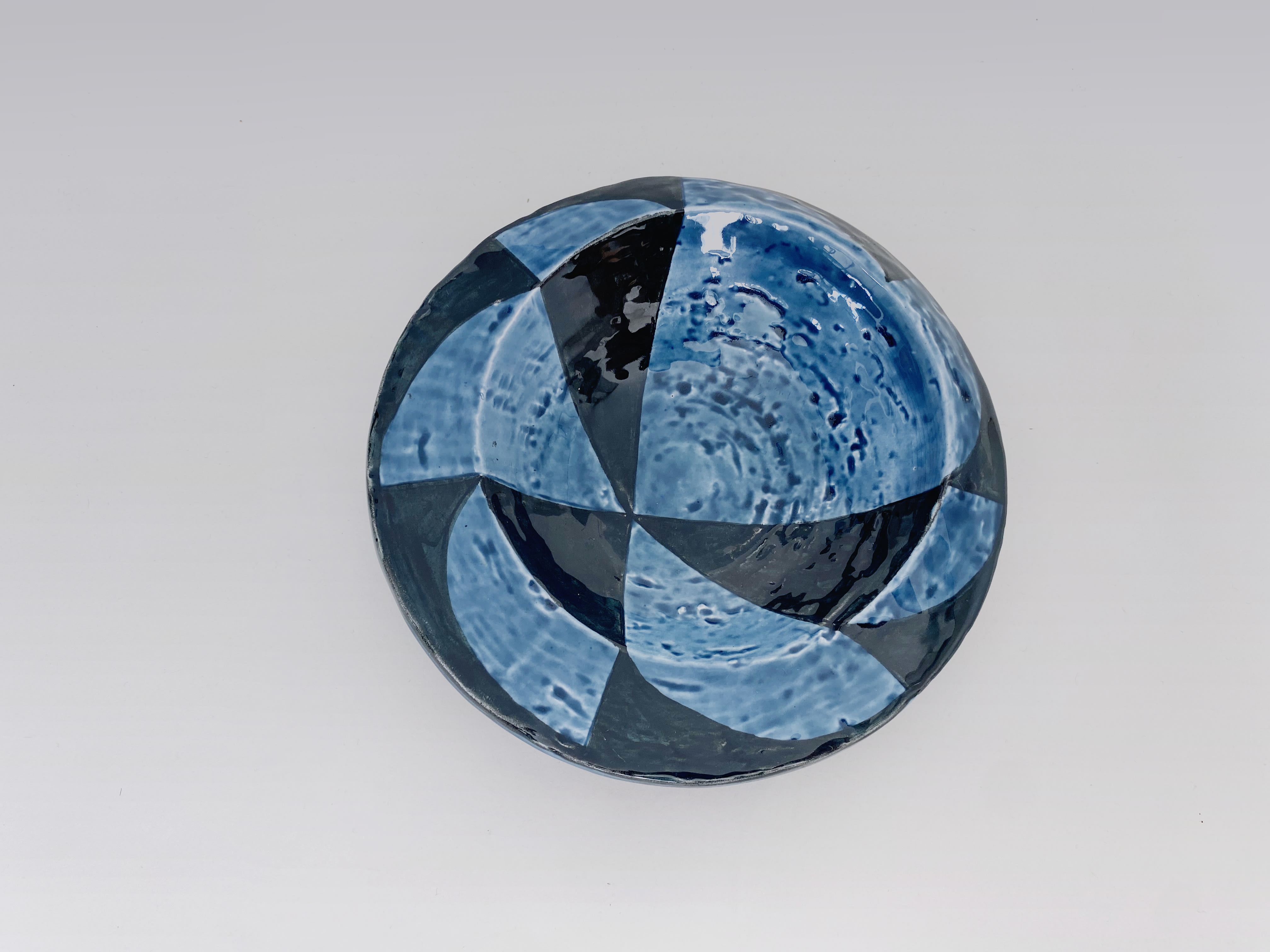 Biomorphic shaped chamotte clay bowl with blue and black geometric pattern. Designed by Vilhelm Bjerke Petersen for Rörstrand in the 50's. Mint condition.